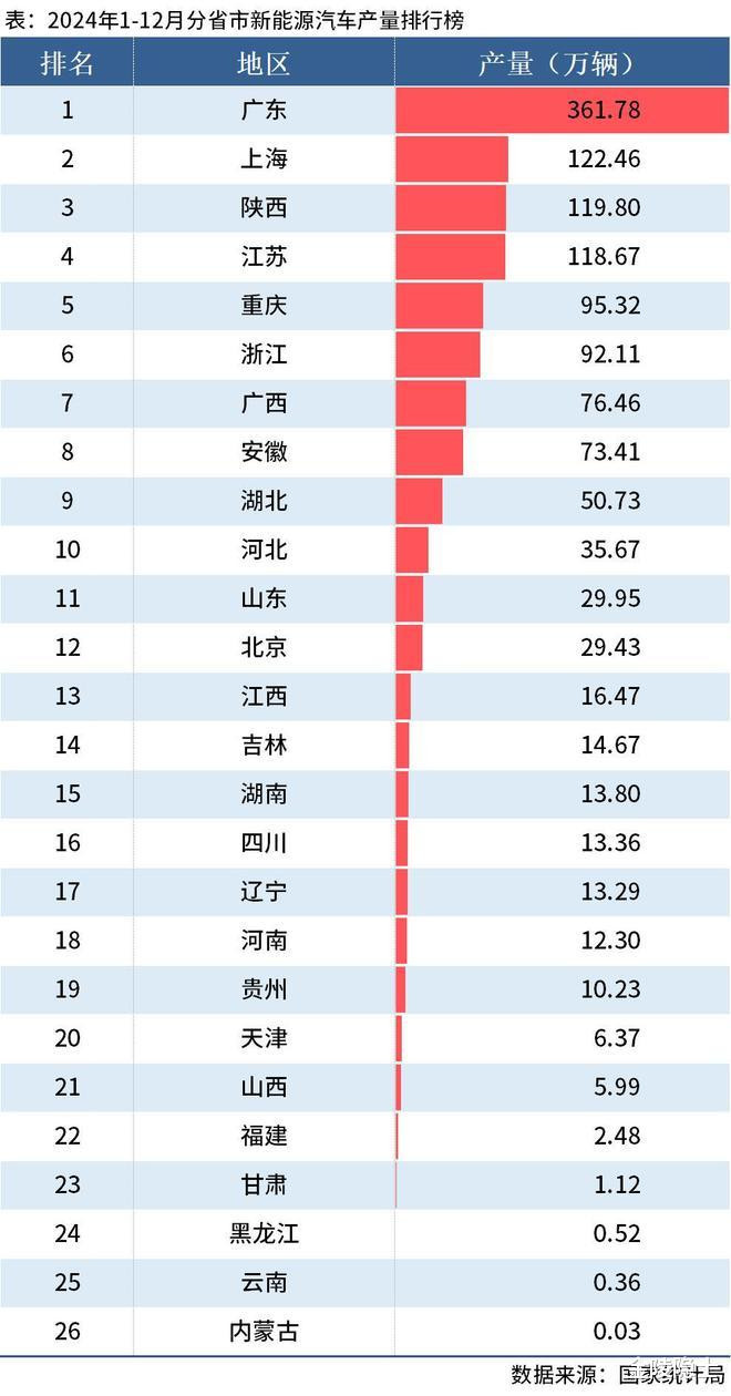 以2024年为例,各省市的新能源汽车产业差距是非常大的。可以看到,长三角和珠三角占据了半壁江山。